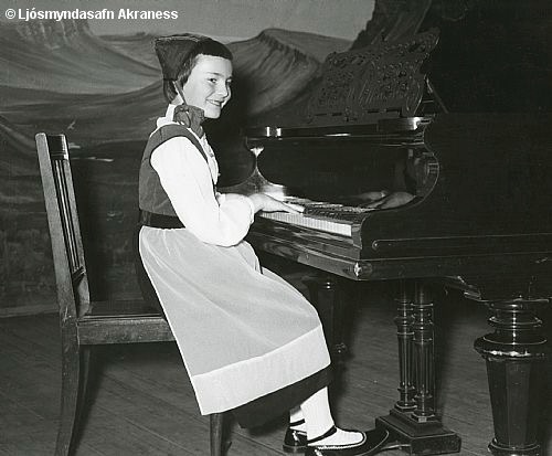 Pabbi sá til þess að ég var innrituð í tónlistarskólann 8 ára gömul. Anna Magnúsdóttir var fyrsti kennari minn. Oftar en ekki var ég í tímum heima hjá henni. Hún var einstaklega elskuleg við mig og er mér minnisstæð lyktin í íbúðinni, hún hafði oft kveikt á reykelsi. Tónfræðitímarnir voru líka í herbergi í nýja húsinu hennar og vorum við 6-7 stelpur saman í tímum. Mér fannst tónfræðin ekki skemmtileg og það sem ég lærði var mest utanaðbókarlærdómur. Anna stóð líka fyrir músikfundum með sínum nemendum og þá spiluðu allir. Mér fór vel fram og á öðru ári mínu í tólistarnáminu kom ég fram í árshátíð barnaskólans í Bíóhöllinni. Árshátíðin var árlegur viðburður með fjórum sýningum þar sem fram fóru hin margvíslegustu skemmtiatriði, leikrit bæði stutt og löng, tónlistaratriði, kórsöngur, leikfimisýningar og dansatriði. Þessar skemmtanir voru vel sóttar og flestir bæjarbúar létu sig ekki vanta að horfa á afkvæmin koma fram og sýna hvað í þeim bjó.